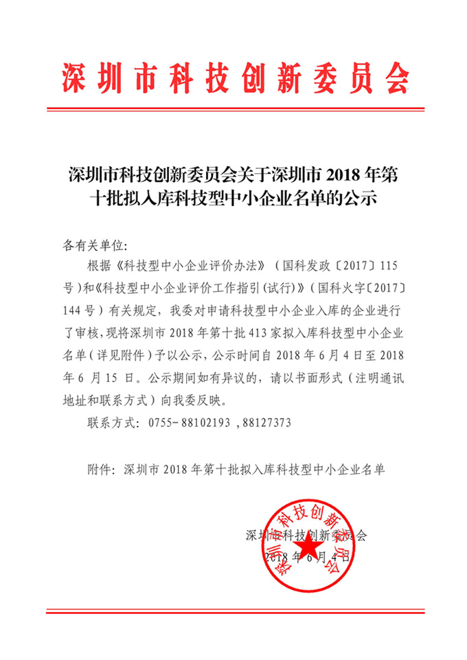 Mit einstimmiger Anerkennung durch die zuständigen Abteilungen der Provinzregierung Guangdong, des Wissenschafts- und Technologieinnovationsausschusses Shenzhen und des Wissenschafts- und Technologieinnovationsbüros des Bezirks Shenzhen Futian wurde es erfolgreich als "technologieinnovationsorientiertes Unternehmen" gelistet.