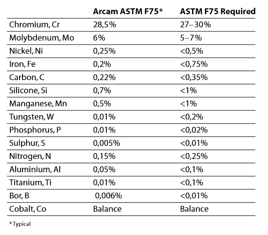 1.3 Applications CoCrMo is typically used for: 1.4 Powder specificationThe Arcam ASTM F75 CoCr alloy powder for EBM is produced by gas atomization and the chemical composition complies with the ASTM F75 standard’s specification. The particle size is 45–100 microns. This limitation of the minimum particle size ensures safe handling of the powder. Please refer to the Arcam MSDS (Material Safety Data Sheet) for more information about the handling and safety of the Arcam ASTM F75 CoCr alloy.